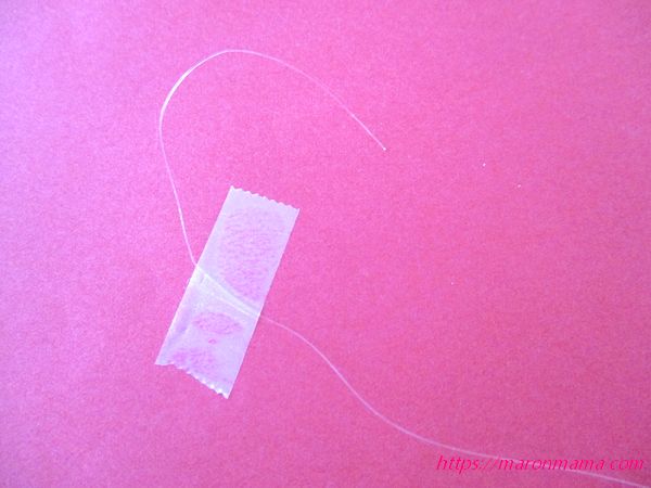 1、ビーズを入れたときに落ちないように、テグスの片側をテープで固定します。