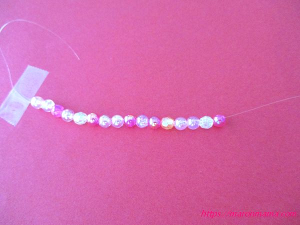 2、ビーズを一つ一つテグスに通していきます。
