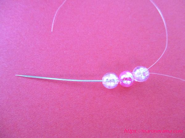 テグスをビーズに通しにくいときは、細い針を使って通すとやりやすいです。ただ、子供さんが手作りするときは注意してください。