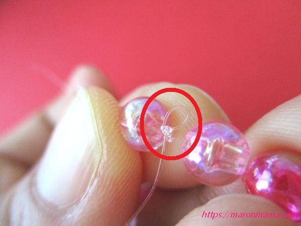 5、ビーズを全て入れ終わったら、テグスで4~5回しっかりと結びます。