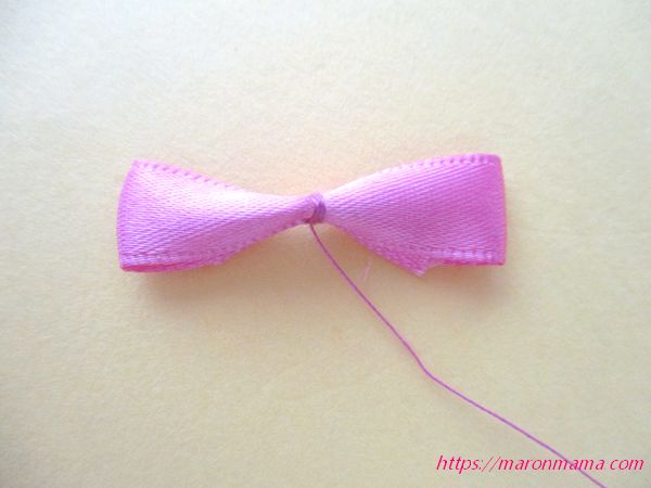 5、リボンの裏側に、写真のように真ん中で横向きに糸を通します。