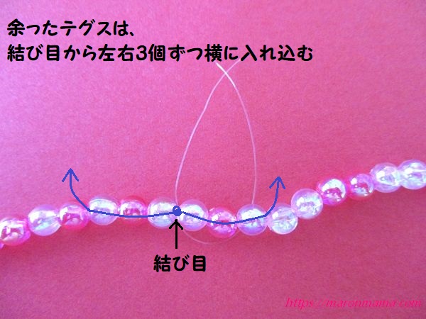 6、余ったテグスは結び目から左右3個ずつ横に入れます。