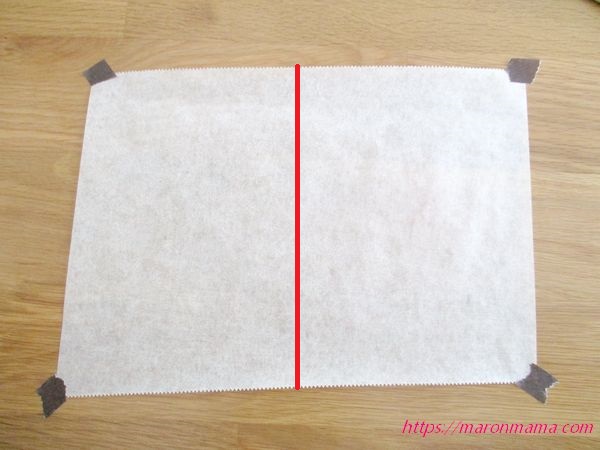 1、クッキングペーパーを20㎝位取り出し、半分に切ります。