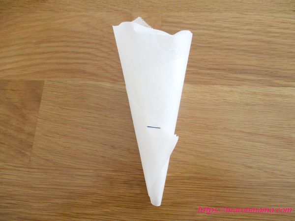 2、半分にした物を先端が三角になるようくるっと巻いて、ホッチキスで留めて漏斗(ろうと)を作ります。