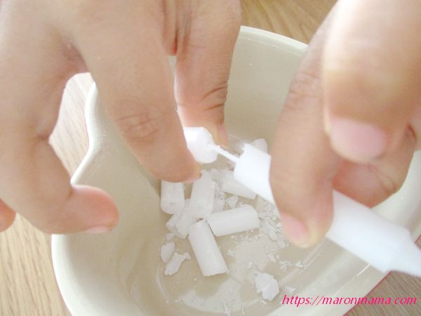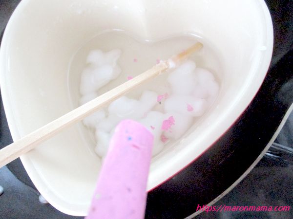 4、半分くらい解けたら、クレヨンをカッターやハサミで削って入れます。