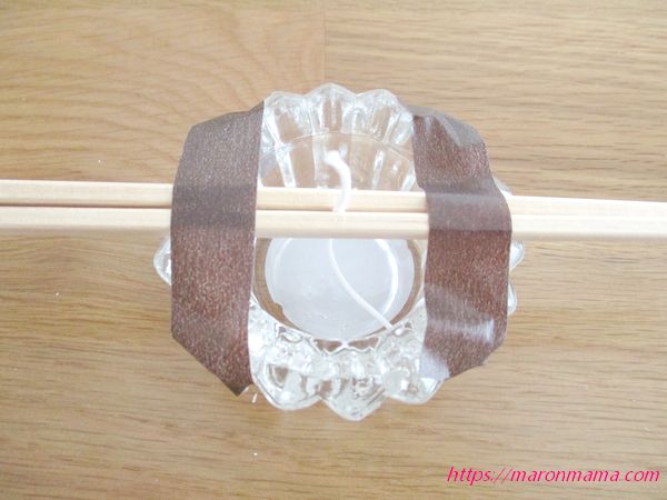 2、容器(耐熱容器や牛乳パック等)にろうそくの芯を中央に合わせ、割りばしで軽く挟み、マスキングテープで写真のように固定します。