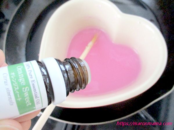 5、ろうそくとクレヨンが解けたらアロマオイルを適量入れます。