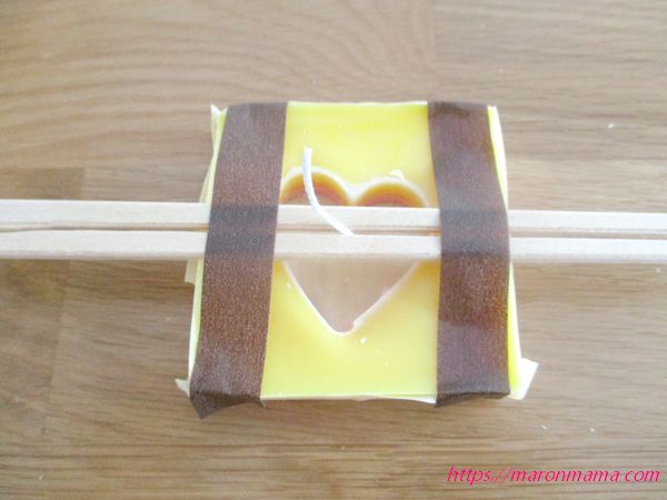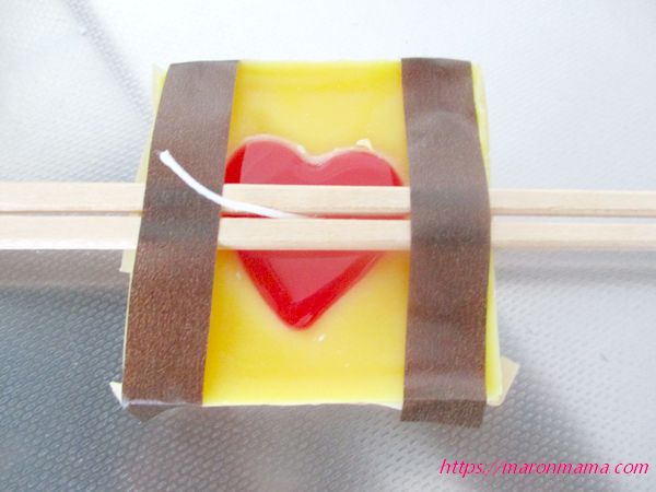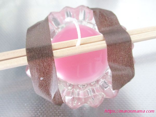 7、1層で終わりの場合は、固まるまで30分ほど待ち、割りばしとマスキングテープを外し、芯が長い場合はハサミで切り調節します。