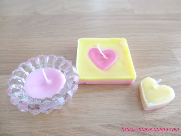 今回は、耐熱容器に入れたキャンドルと、牛乳パックやハートの型抜きをしたキャンドルの3種類を作りました。