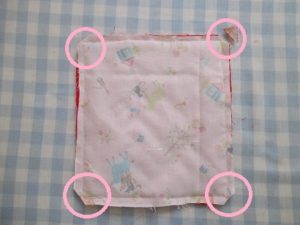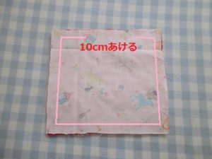 後で柄がある方を、10㎝開けたところからひっくり返すので、うっかり縫ってしまわないように注意して下さい。