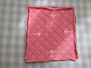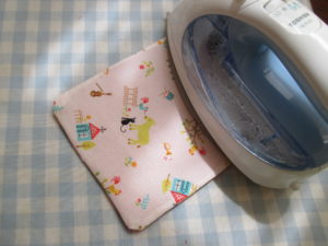 5、作業2で10㎝開けた所からひっくり返し、色、柄が出るようにして、アイロンをかけます。