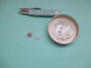 もし、完成前に花の中央のビーズが写真のように、上から見て穴が見えていたら横にくるように直して下さいね。