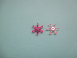 1、フラワービーズを好きな色2種類選び、片方を上にして、下のビーズと少しずらして重ねます。