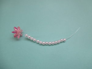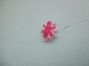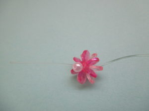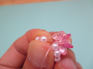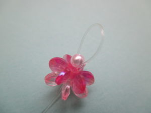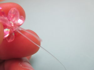 4、テグスを写真のように、先ほど通した花形ビーズの穴に再び通します。