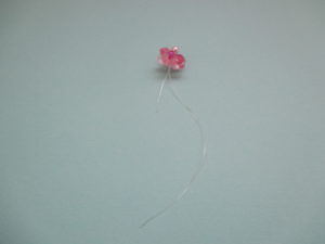 少し見にくいですが、写真のようになります。長いテグスの方にビーズを通していきます。