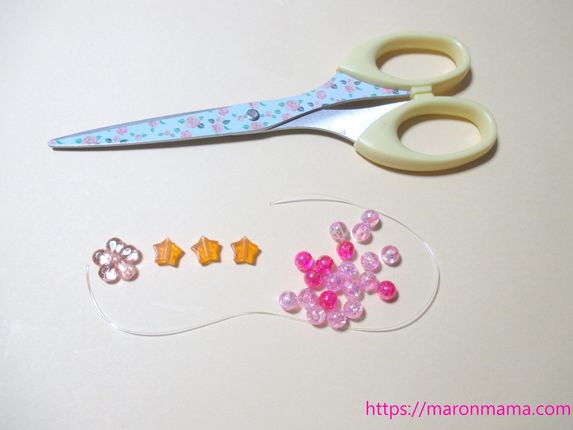 6㎜ラウンドビーズと星型ビーズ、のびるテグスは100均で揃えることができます。