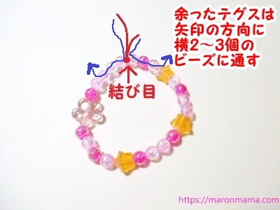 5、結んで余ったテグスは、横のビーズ2~3個くらいに入れます。