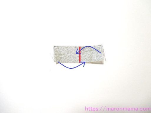 1、リボンの左右の端を写真のように、中心の赤線より少し内側に折ります。