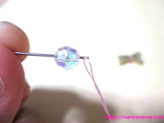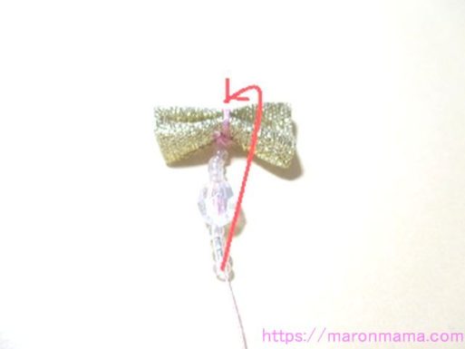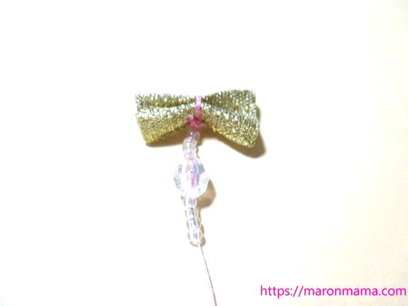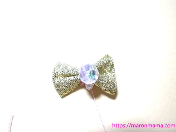 8、通したビーズをリボンの中心に、写真のようにぐるっと巻き付けます。