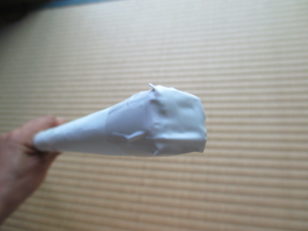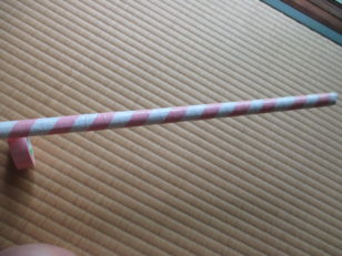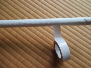 13、出来上がった棒の、上の部分と下の部分を白いビニールテープで縦横十字に貼り、写真のようにふさぎます。