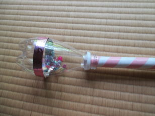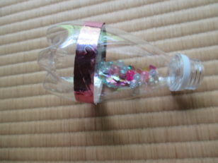 ペットボトルの中にキラキラビーズを入れるので、振ると音が鳴ると共に、キラキラと光ります。